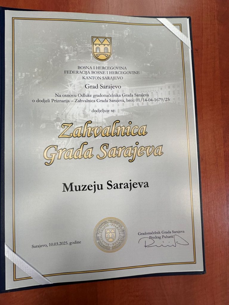 Muzej Sarajeva je primio zahvalnicu od Grada Sarajeva za doprinos očuvanju i promociji kulturno-historijske baštine. Zahvalnicu je direktorici Muzeja, Indiri Kučuk-Sorguč, uručio gradonačelnik Predrag Puharić, čime je još jednom potvrđena dobra saradnja između muzeja i Grada, te su prepoznati reformski poduhvati koje je Muzej Sarajeva napravio u prošloj godini obnavljajući svoje depandanse – nacionalne spomenike kulture i razvijajući kroz intenzivne i kvalitetne programske aktivnosti komunikaciju sa kulturnom javnošću, turističkim operaterima i što je najvažnije svojim posjetiteljima.