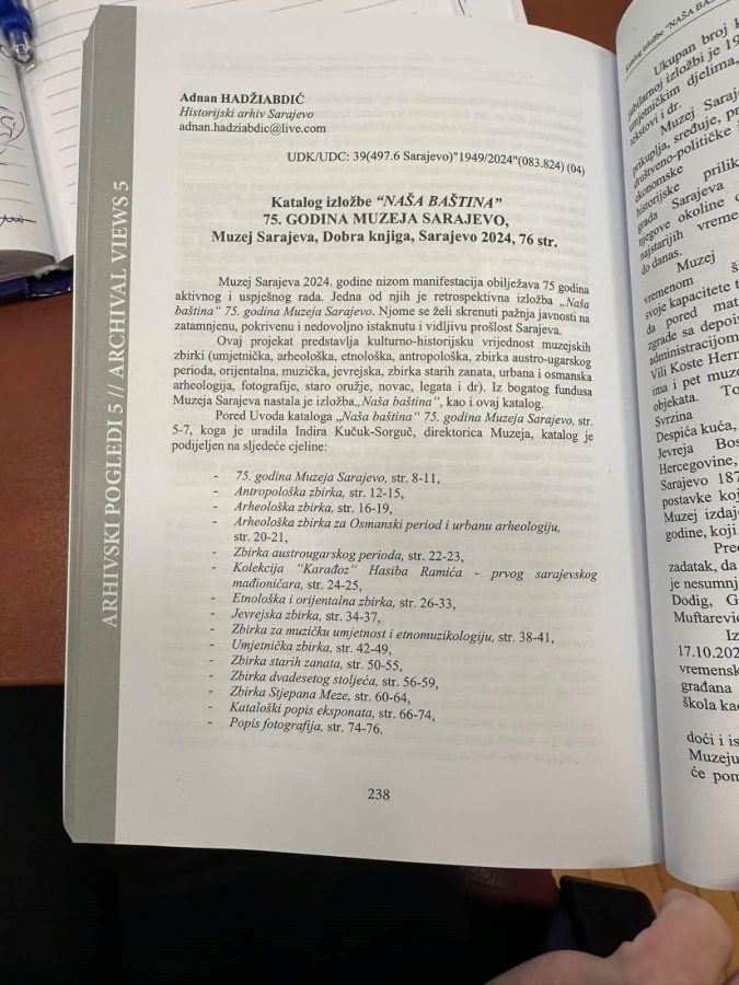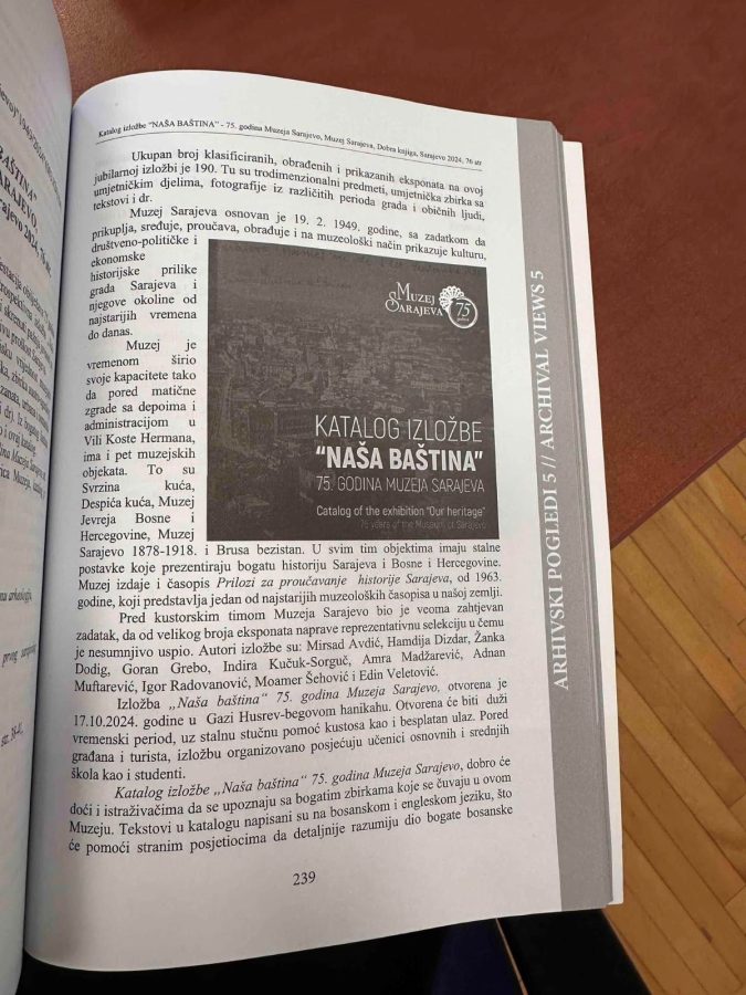 U petom broju časopisa “Arhivski pogledi”, koji izdaje Društvo arhivskih zaposlenika Tuzlanskog kantona, objavljen je osvrt na izložbu i katalog “Naša baština” autora Adnana Hadžiabdića, arhiviste Historijskog arhiva Sarajeva.
