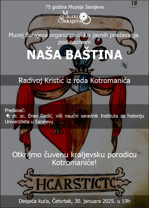 U Despića kući, 30. januara 2025. godine, s početkom u 19:00 sati, dr. Enes Dedić će održati predavanje na temu “Radivoj Kristić iz roda Kotromanića”.