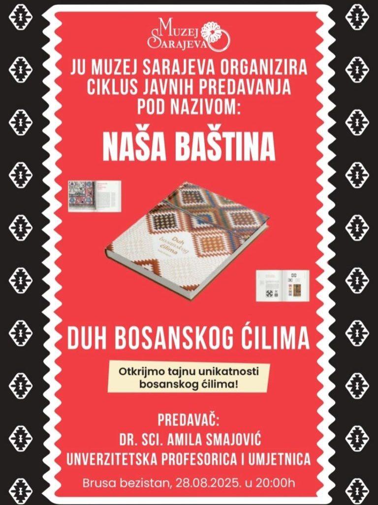 U okviru ciklusa javih predavanja “Naša baština” zadovoljstvo nam je najaviti predavanje „Duh bosanskog ćilima“, koje će održati dr. sci. Amila Smajović – umjetnica, komunikologinja i autorica prve sveobuhvatne studije o bosanskom ćilimu.